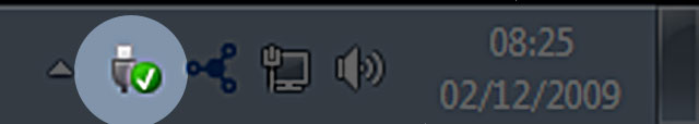 Klik op het plugpictogram in het systeemvak onderaan recht. Het heeft een wit vinkje binnen een groene cirkel.