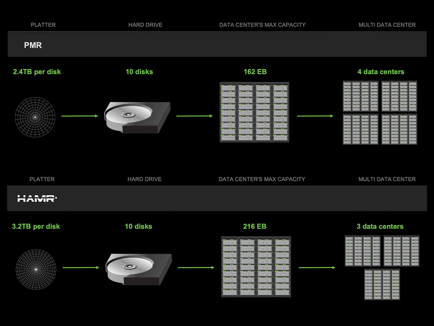 The image below demonstrates how three data centers equipped with HAMR technology can contain an equal or higher amount of exabytes of data compared to four data centers using traditional PMR drives. That’s as much (if not more) data storage within one less data center, which can cost hundreds of millions to low billions of dollars to construct and equip, and tens of millions of dollars more annually to keep it powered up.