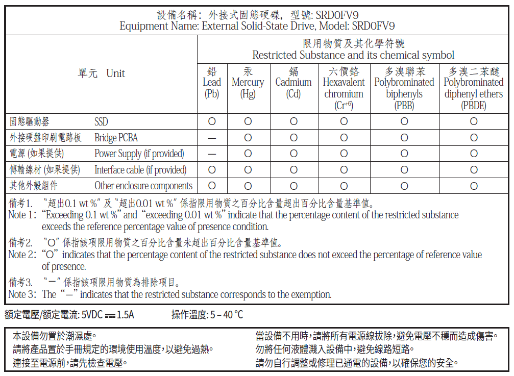 Taiwan RoHS refers to the Taiwan Bureau of Standards, Metrology and Inspection’s (BSMI’s) requirements in standard CNS 15663, Guidance to reduction of the restricted chemical substances in electrical and electronic equipment. Beginning on January 1, 2018, Seagate products must comply with the “Marking of presence” requirements in Section 5 of CNS 15663. This product is Taiwan RoHS compliant. The following table meets the Section 5 “Marking of presence” requirements.