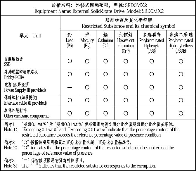 Taiwan RoHS refers to the Taiwan Bureau of Standards, Metrology and Inspection’s (BSMI’s) requirements in standard CNS 15663, Guidance to reduction of the restricted chemical substances in electrical and electronic equipment. Beginning on January 1, 2018, Seagate products must comply with the “Marking of presence” requirements in Section 5 of CNS 15663. This product is Taiwan RoHS compliant. The following table meets the Section 5 “Marking of presence” requirements.