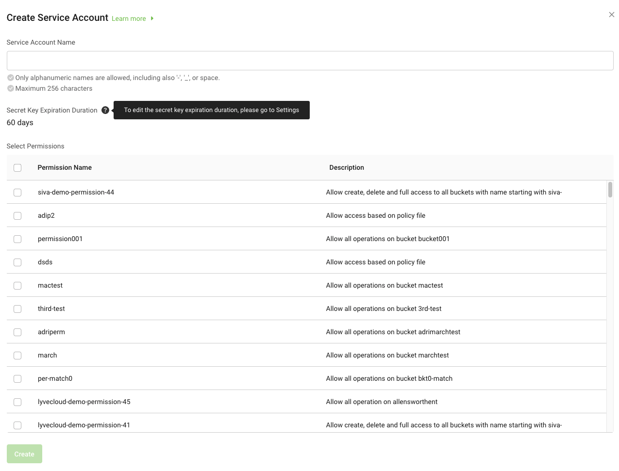 You must have at least one associated permission before creating a service account. To set the duration of keys generated after service account creation, you must first configure the expiration period. If the expiration duration is not set, the service account will not have an expiration set, and the secret credentials will never expire. For more information, see Setting expiration duration.
