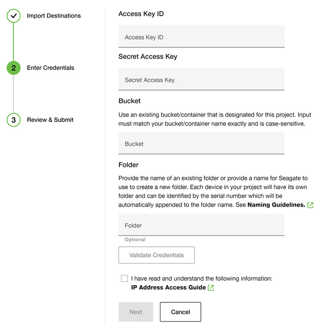 Add your cloud destination credentials and bucket information to configure your cloud import plan.