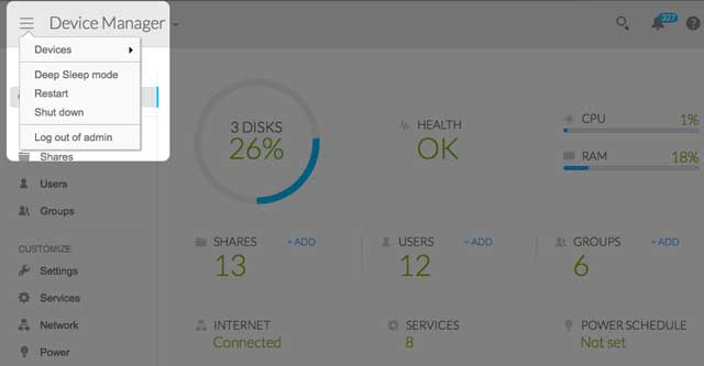Important info: When the product is operating, a short push of the on/off button will turn the 8-bay NAS off or, place the 8-bay NAS into deep sleep mode if the option has been configured in NAS OS. A long push of more than four seconds will cut the power from the NAS, forcing it to shut down immediately. A long push is not recommended as it may result in data loss.