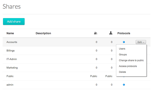 • To review the options for the share, pass the cursor to the far right of the share's row to make the Edit pull-down menu visible. Most of the options are explained above. Additional options include changing the share's network access (public or private) and deleting the share.