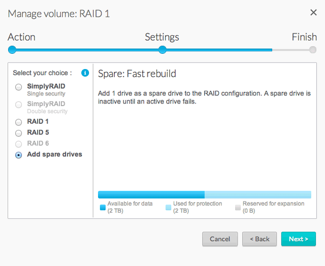SimplyRAID and spare disks: NAS OS optimizes storage capacity using all disks in a SimplyRAID volume. Therefore, a spare disk is not supported with SimplyRAID.