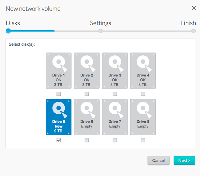 Important info on creating a single-disk volume: Single-disk volumes can be created with expansion in mind. For example, you can launch the New network volume wizard to create a single-disk volume using SimplyRAID, JBOD, or RAID 1. Though the volume will not provide data protection in a single-disk configuration, it is prepared for expansion when you add one or more disks to it. If you intend to expand the volume to four or more disks, consider using SimplyRAID since RAID 1 cannot reach beyond three disks.