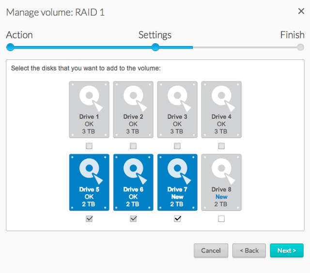 - Apart from RAID 0 and RAID 10, RAID volumes can be expanded with new disks. However, it is not possible to add new disks with inferior capacities. For example, a RAID 5 or SimplyRAID volume with three 2TB disks supports the addition of a fourth disk that is 2TB or higher. NAS OS will alert you if a disk cannot be added to the volume.