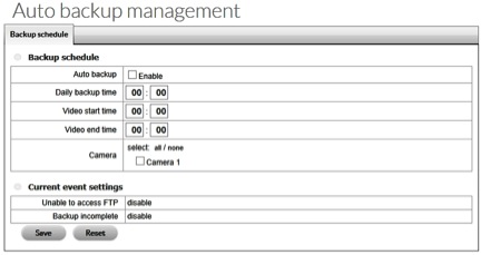 Backups to the FTP server are performed daily, saving video from the previous day. The administrator chooses the time period to back up.
