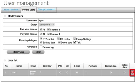 - Add the user to a Group. For example, a Power user has access to all settings, except FTP, Backup, Network, Users, License, Logs, Save and Load.