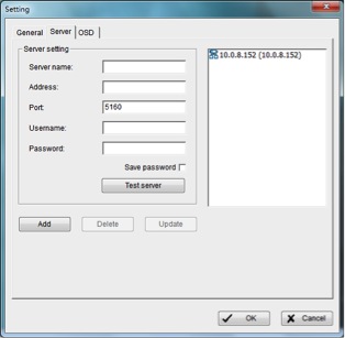 - Click General settings and select the Server tab to set the connection to one or more servers. See Add Server.