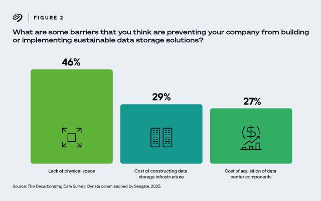 As the increasing use of AI drives up data creation, organizations need more room for ever-expanding data volumes, and many struggle with space limitations. Spatial constraints affect their ability to expand and implement more sustainable storage solutions. In addition, high up-front costs associated with sustainable infrastructure remain a significant barrier to progress.