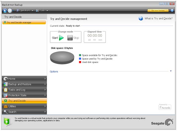 If you use Windows Vista, please, be aware that in the Try&Decide mode the program may use the free space in the BlackArmor Backup Secure Zone quite intensively, even when your computer is idle. This is due to Windows Vista's housekeeping activities such as indexing that run in the background.