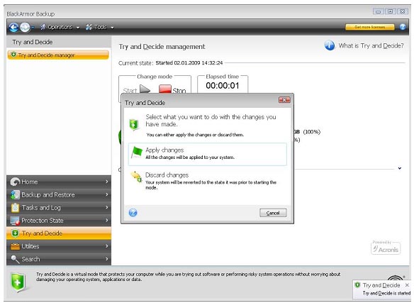 The Try&Decide feature allows creating a secure, controlled temporary workspace on your computer without requiring you to install special virtualization software. You can perform various system operations not worrying that you might damage your operating system, programs or data.