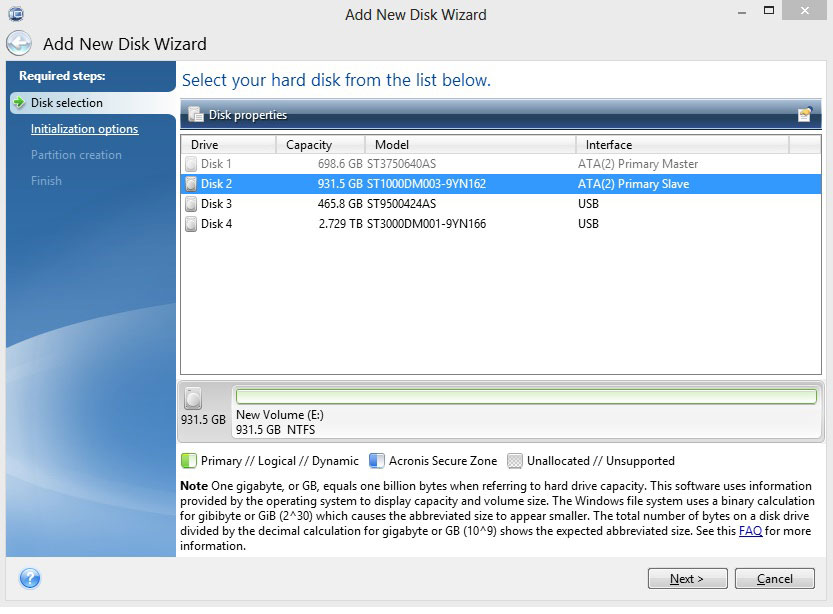 - Select the disk you would like to Add/Format, then click Next.