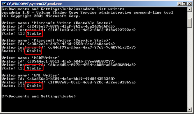 - You should see several MS writers. These should list as stable. If they are not stable or if they are not listed, then VSS may be broken (see steps below).