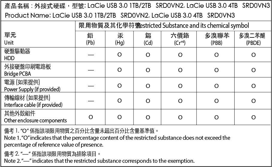 Taiwan RoHS refers to the Taiwan Bureau of Standards, Metrology and Inspection’s (BSMI’s) requirements in standard CNS 15663, Guidance to reduction of the restricted chemical substances in electrical and electronic equipment. Beginning on January 1, 2018, Seagate products must comply with the “Marking of presence” requirements in Section 5 of CNS 15663. This product is Taiwan RoHS compliant. The following table meets the Section 5 “Marking of presence” requirements.